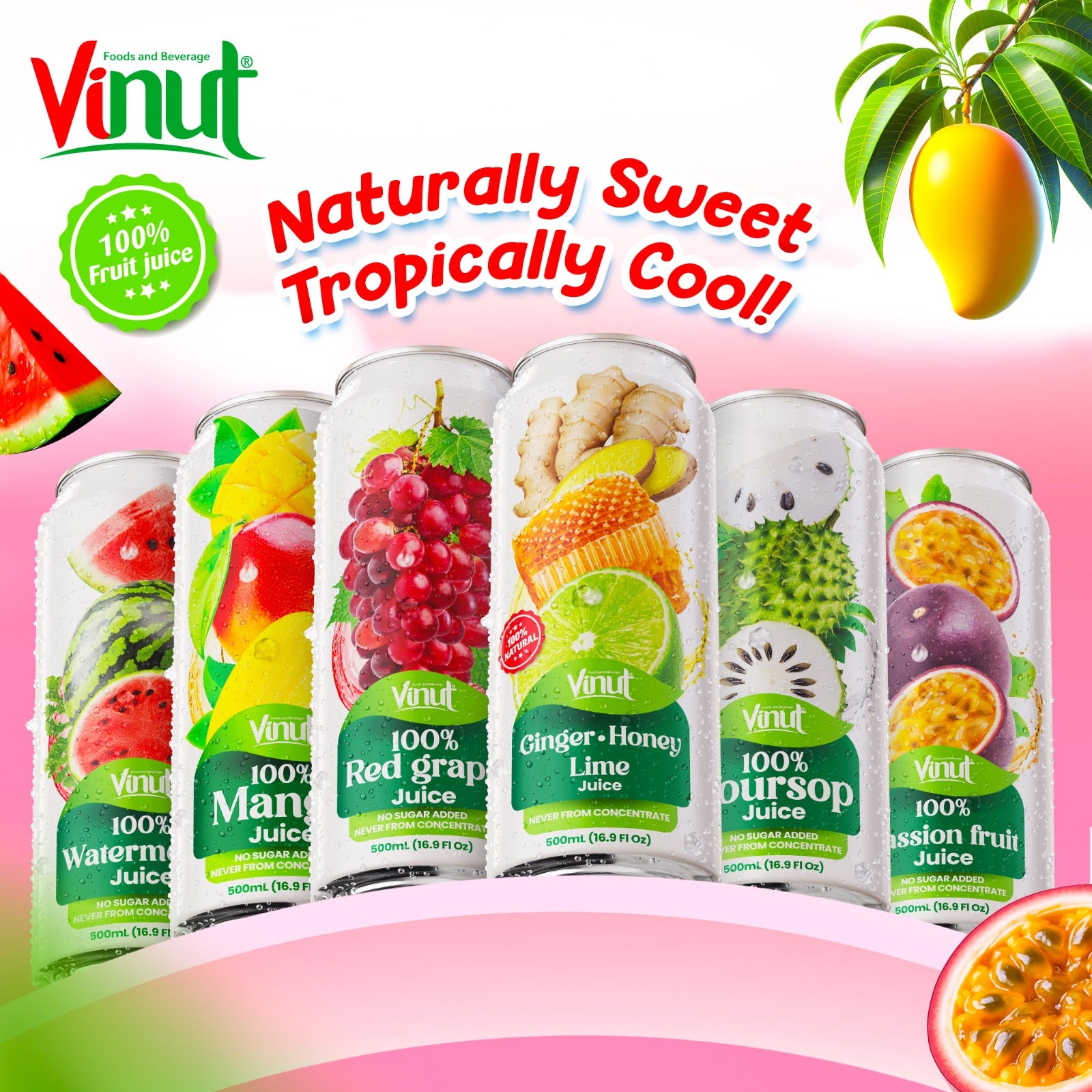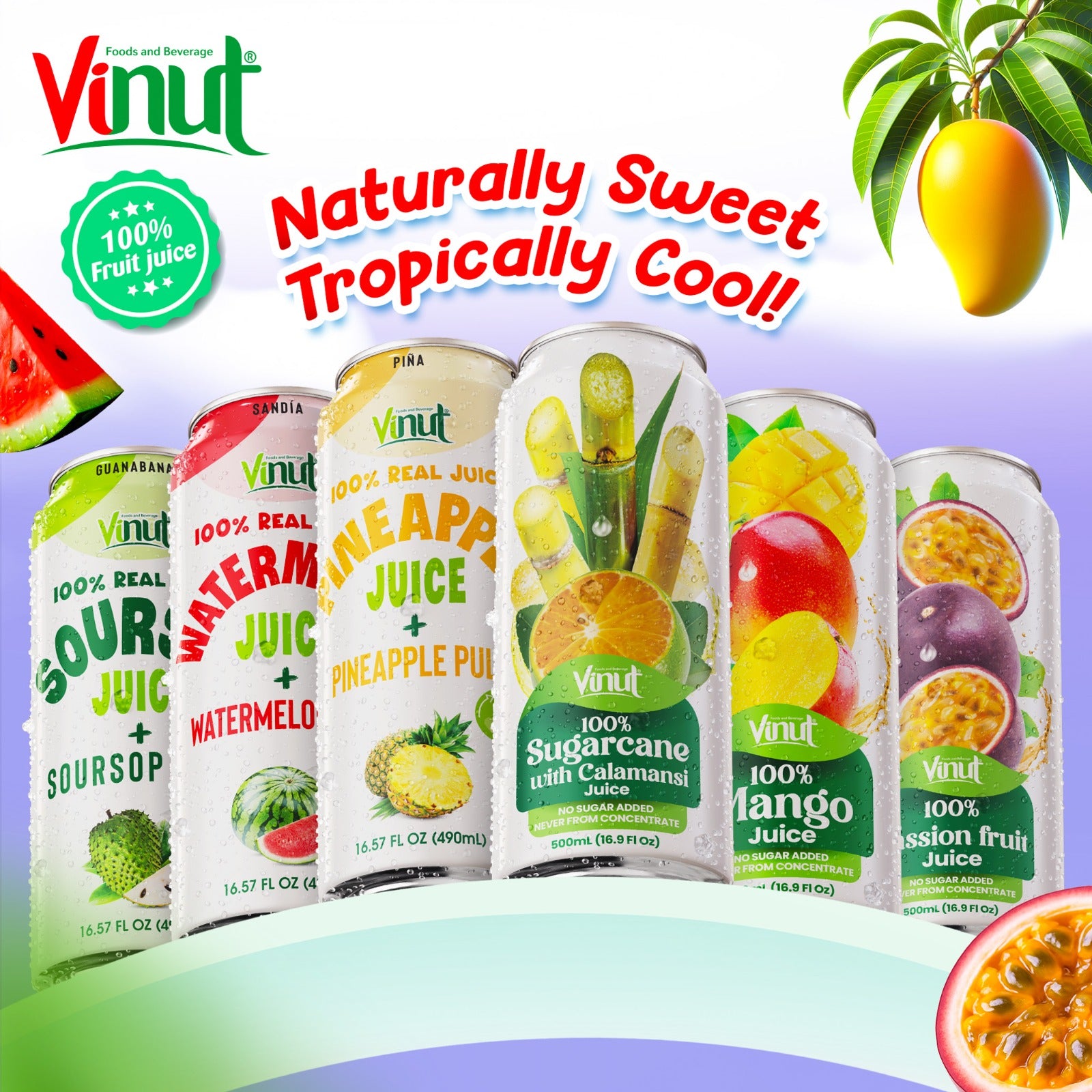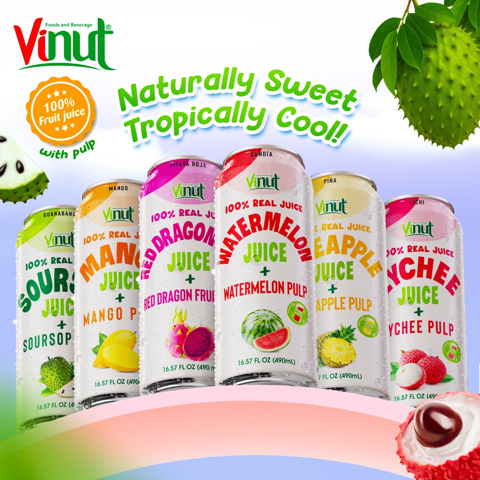 VINUT is real fruit, never from concentrate, with 0g added sugar and no artificial sweeteners, so it tastes like the fruit—not candy or chemicals. Most “juice drinks,” sodas, and fizzy fads rely on added sugar or sweeteners and leave a syrupy or strange aftertaste; VINUT stays clean, bright, and true-to-fruit in a generous 16.57 oz tallboy.